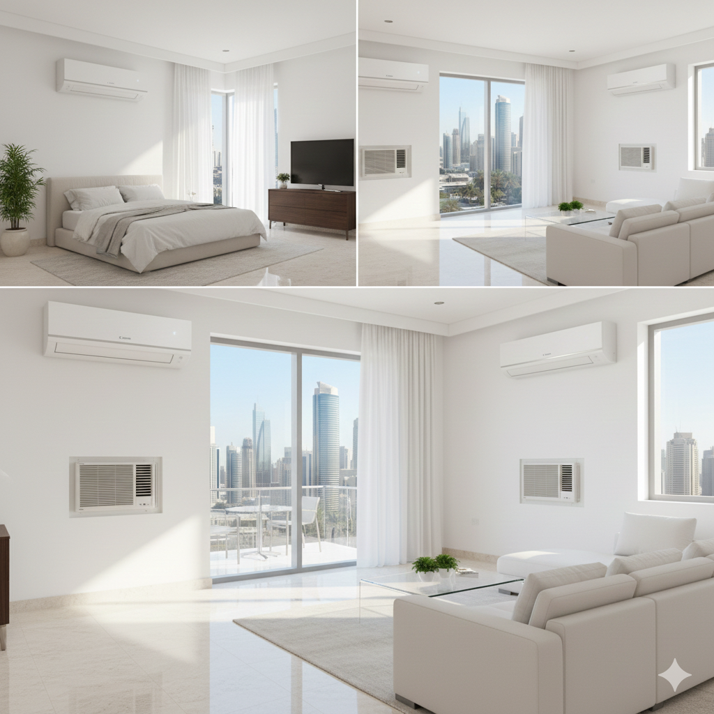 Split ACs remain the top choice in Dubai, Abu Dhabi, and Sharjah due to their aesthetics and efficiency, while window ACs are still common in older buildings in Deira, Rolla, and Ajman.